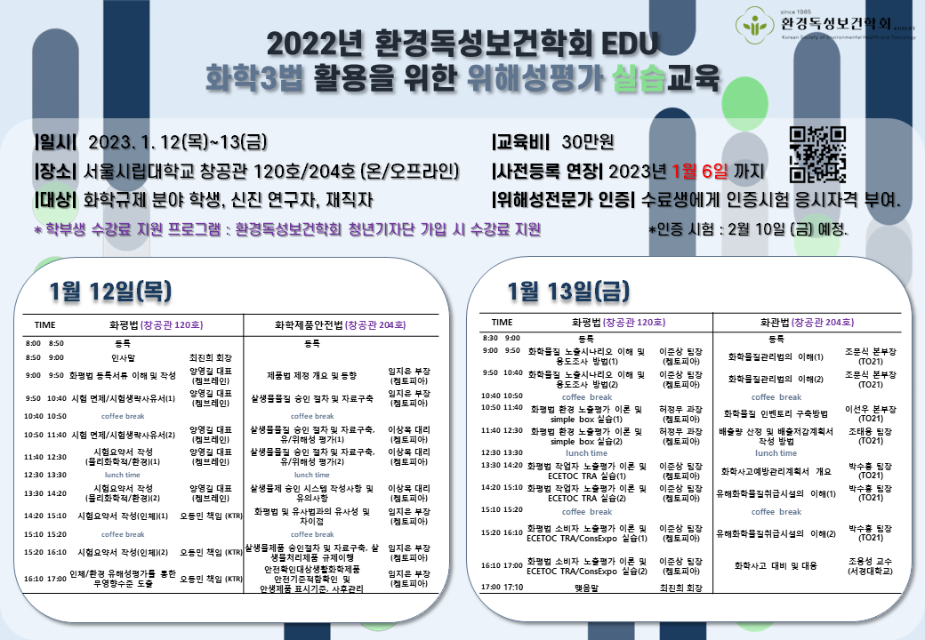 타기관(환경독성보건학회)의 위해성평가 교육 소식을 전해드리며 많은 관심 부탁드립니다.