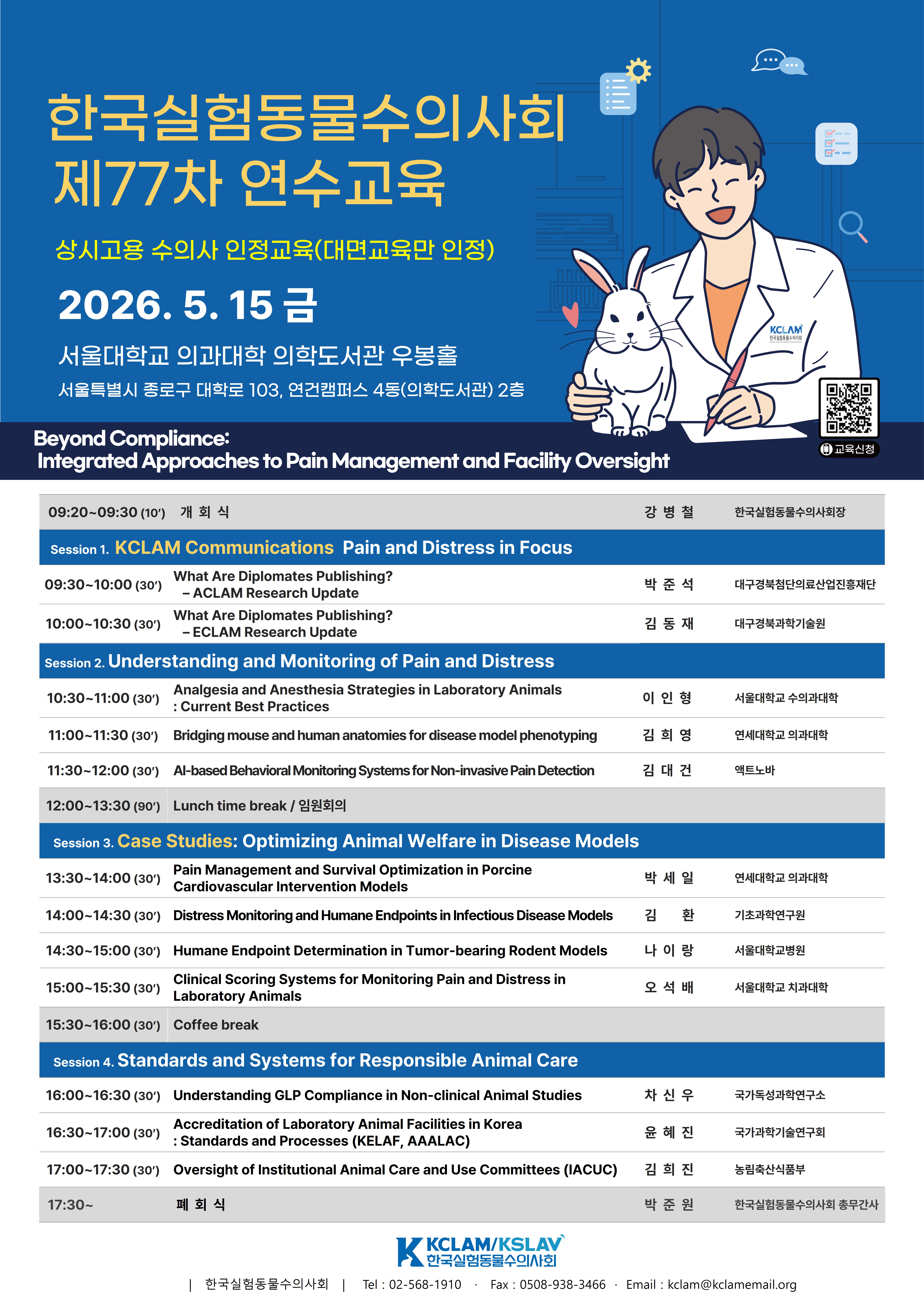 실험동물 알러지 및 수의사를 포함한 실험동물종사자의 건강 관리 등을 다룰 예정이오니 관심 있는 분들의 많은 참여바랍니다.