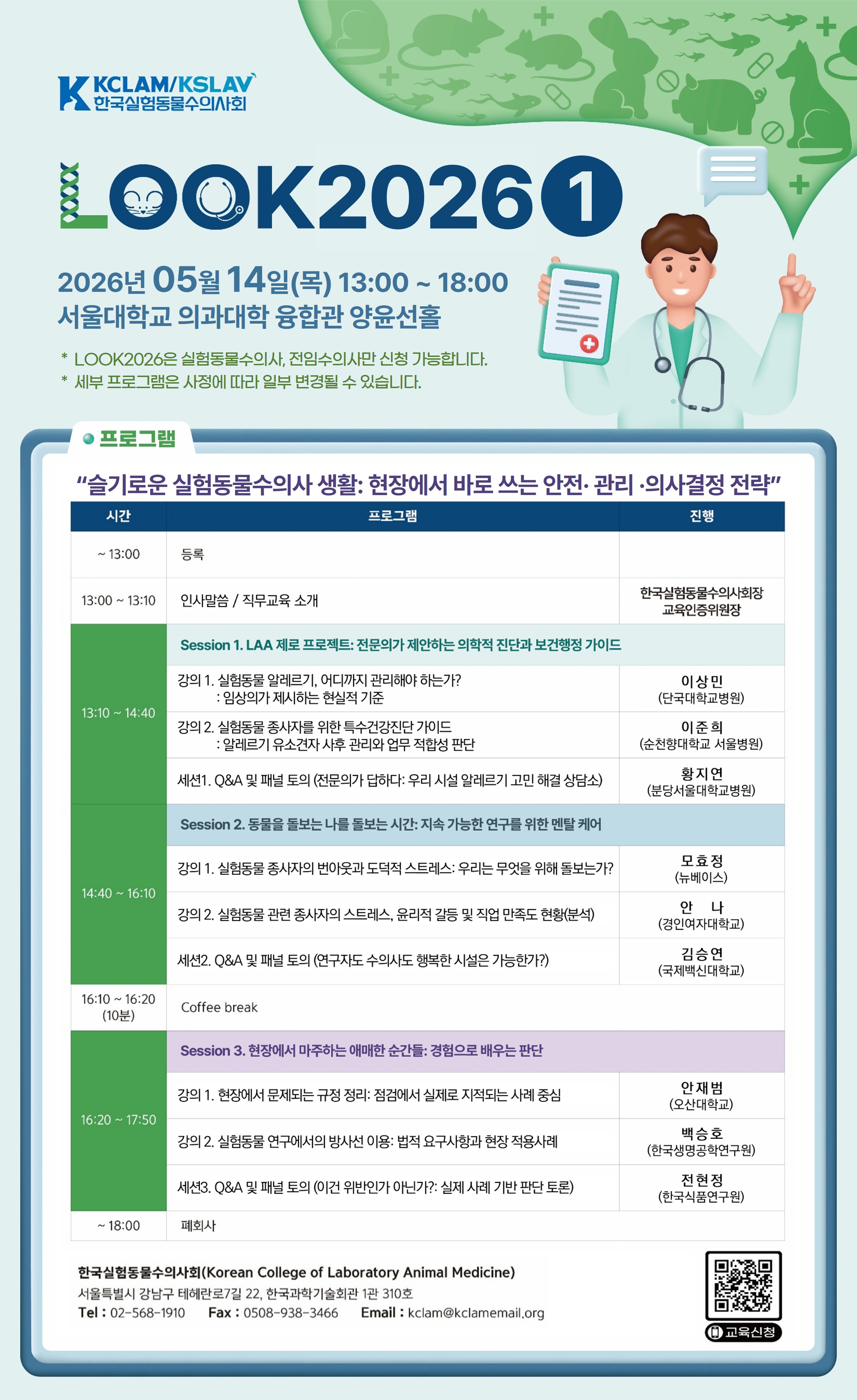 더불어 전임수의사 및 실험동물수의사의 직무능력 향상과 역량 강화를 위해 LOOK2026-1(직무교육)도 함께 진행됩니다.